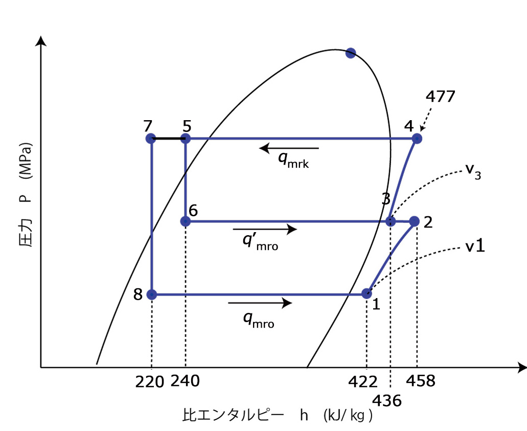 | 高段圧縮機吸込み蒸気の比エンタルピー | \(h_{3}\)=436 kJ/㎏ |