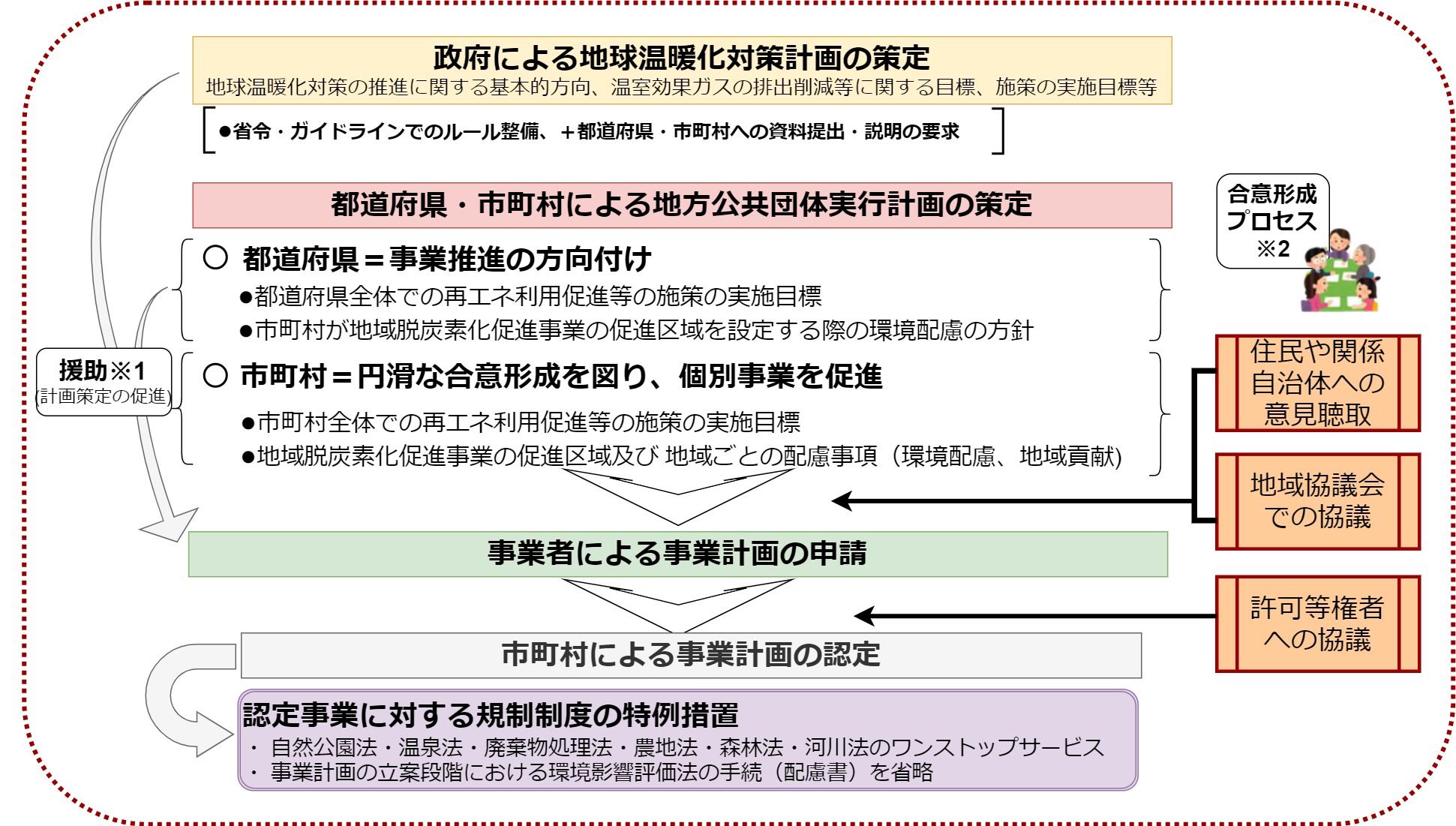※2 住民その他の利害関係者や関係地方公共団体の意見聴取(第21条第10項及び第11項)や、協議会が組織されているときは当該協議会における協議が必要(第21条第12項)。協議会は、関係する行政機関、地方公共団体、地域脱炭素化促進事業を行おうとする者等の事業者、住民等により構成